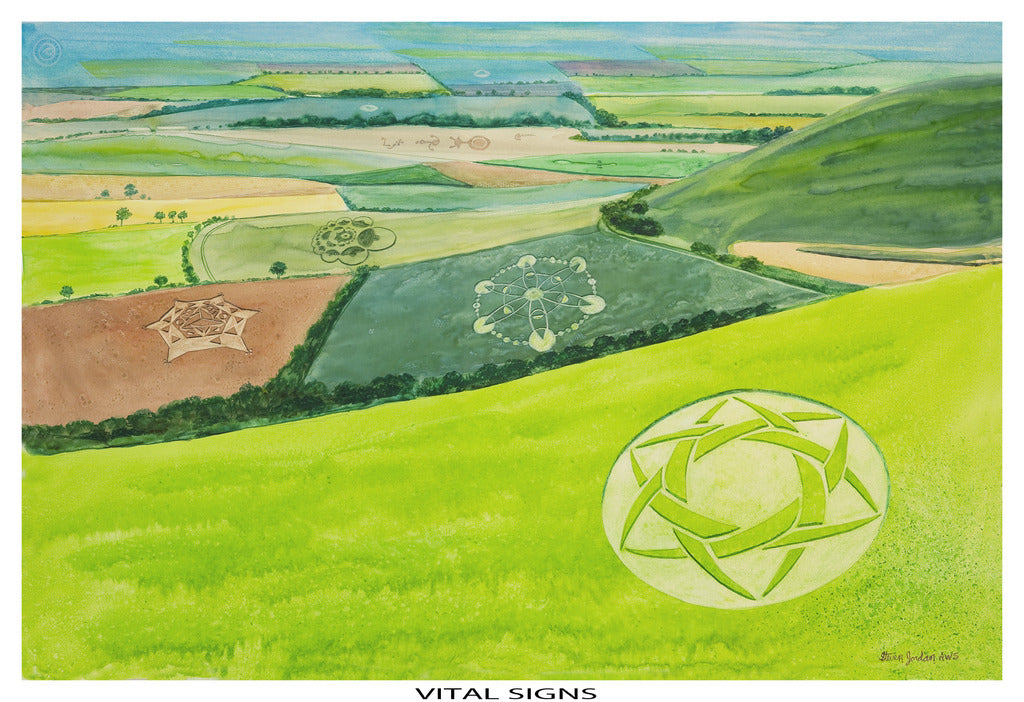 This painting is one of a series based on an actual crop formations in England. Artistic license was used to depict more than were really seen in this landscape.
